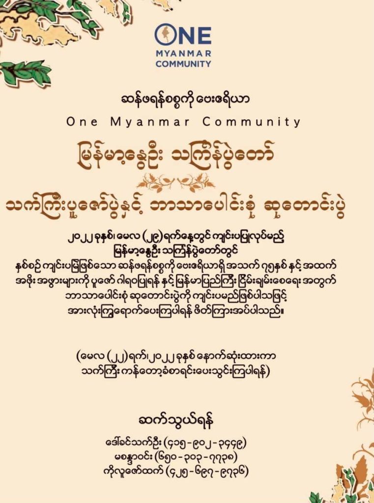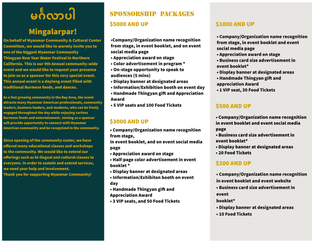 The Bay Area Thingyan promotes cultural diversity and is essential for strengthening community values in the San Francisco Bay Area through the development of intercultural awareness. Activities will include sprinkling of water, traditional culture thingyan dance, elderly homage ceremony, and water festival music entertainment as well as traditional food.