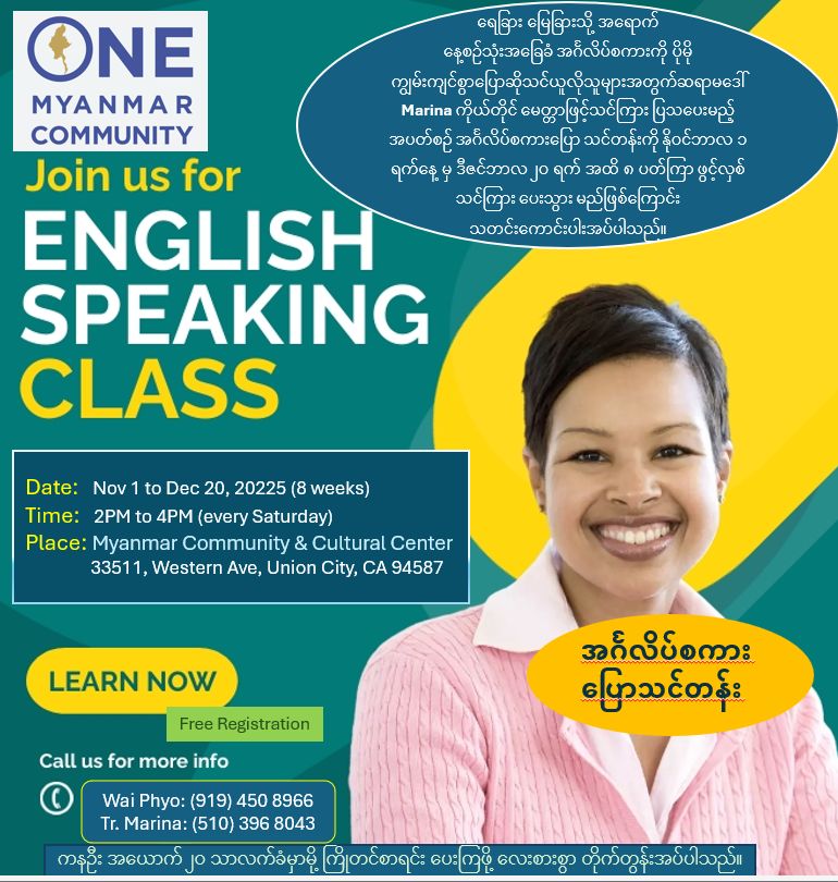Myanmar Community and Cultural Center 33535 Western Ave, Union City, CA, United Statesအမေရိကန်နိုင်ငံသို့ ရောက်လာပြီး မိမိတို့၏ အင်္ဂလိပ်စကားပြော တိုးတက်ဖို့ သင်ယူလေ့ကျင့်လိုသူများ အားလုံးအတွက် တီချယ် Marina ရဲ့ အင်္ဂလိပ်စကားပြောသင်တန်းကို One Myanmar Community (OMC) မှစီစဥ် ဖွင့်လှစ်လိုက်ပါပြီ။ သင်ယူလေ့လာဖို့ စိတ်ဝင်စားသူများအားလုံးကို ဖိတ်ခေါ်ပါတယ်။ လူအများသိအောင်လည်း ဖြန့်ပေးကြပါဦးနော်။OMC’s English Speaking ClassFor everyone who has arrived in the United States and wishes to improve their English speaking skills, Teacher Marina’s English Speaking Class is now open.All those who are interested in learning...